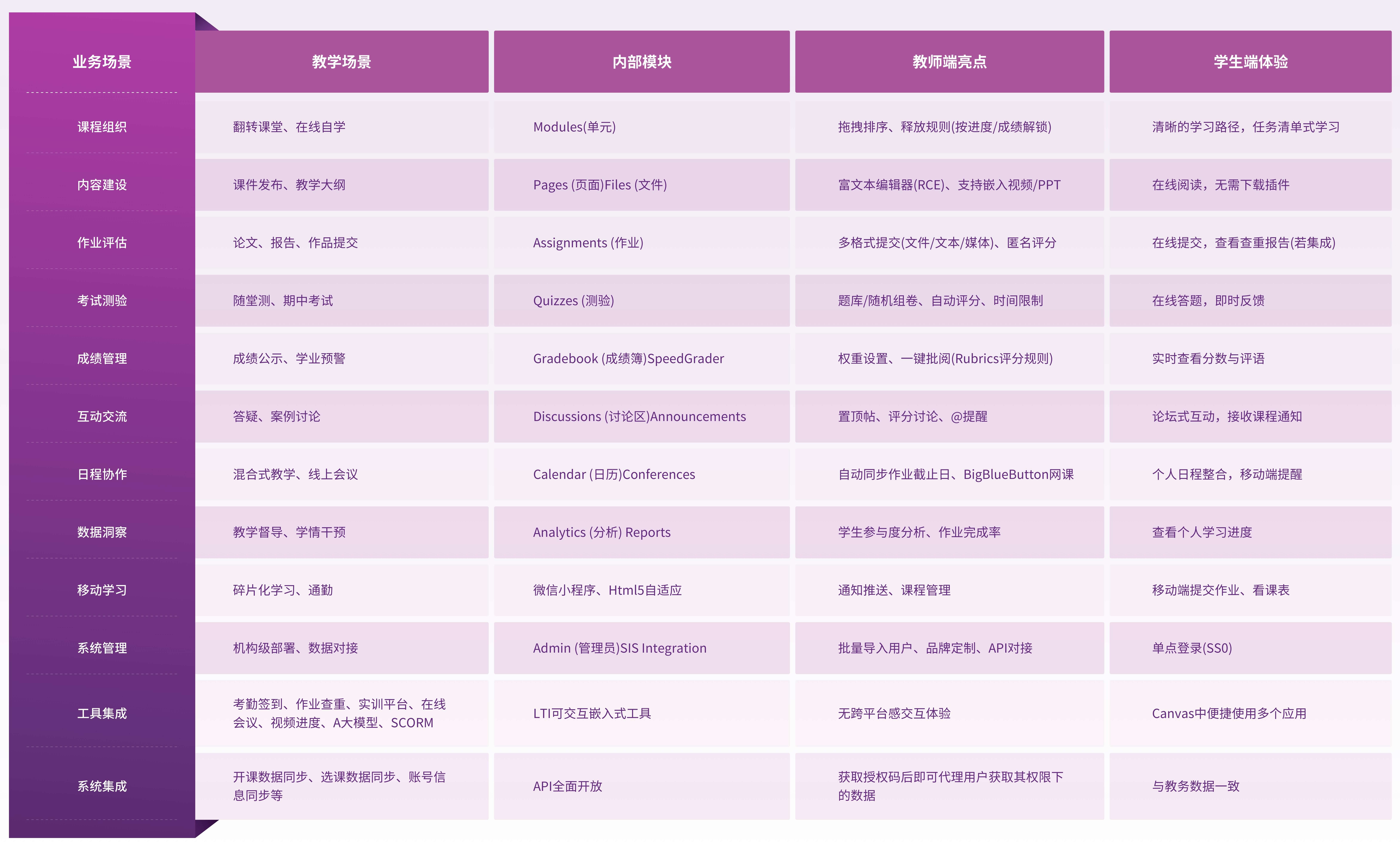 Canvas学习管理系统可以满足课程创建、资源管理、交流互动、学习评测、学习行为数据记录与分析、移动学习等各种教学需求,可支撑课堂教学、混合式教学、翻转课堂、在线教学等各类教学场景。